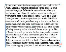 | If you simply want to draw an open path, just click on the Pencil Tool and, with the left mouse button pressed, drag it around the page. Release the mouse button when you have drawn your shape. If you have made a mistake and you want to undo it, just press Control + Z or go to Edit > Undo (name of command you have just used). This Undo command works with just about any action you perform in InDesign and you can undo everything up to the point you have opened your document. However, in that case, instead of using so many undos it is much faster to just go to File > Revert. You will go back to the last time you have saved your document. (To save a document go to File > Save or File > Save as if you want to save your document with a different name or in a different folder.) |
