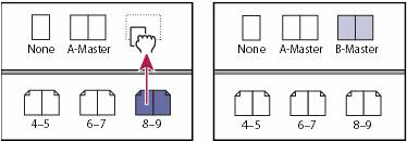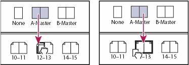 | Fig. Applying a master to a page (left) and applying a master to a spread (right) |