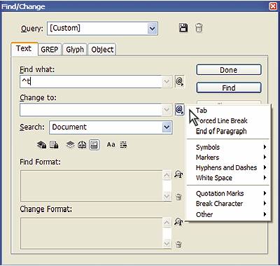 • To search for or replace tabs, spaces, or other special characters, select a representative character (metacharacter) from the pop up menu to the right of the Find What box. You can also choose wildcard options such as Any Digit or Any Character. |