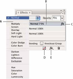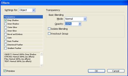 | Indicates opacity settings of Object, Stroke, Fill, and Text and effects applied. Click the triangle to the left of the word Object to hide or display these level settings. The FX icon appears after you apply transparency settings, and now you can double-click the FX icon to edit the settings. |
