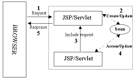 | Consider the following JSP page, say Bean1.jsp, which creates a named instance fBean of type FormBean, places it in the request, and forwards the call to the servlet JSP2Servlet. |