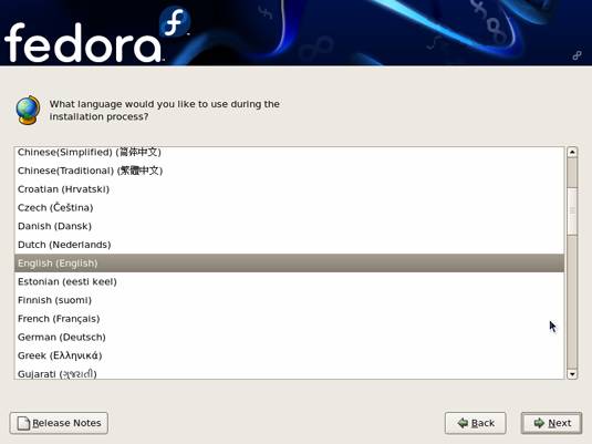 | The installation program displays a list of languages supported by Fedora. |