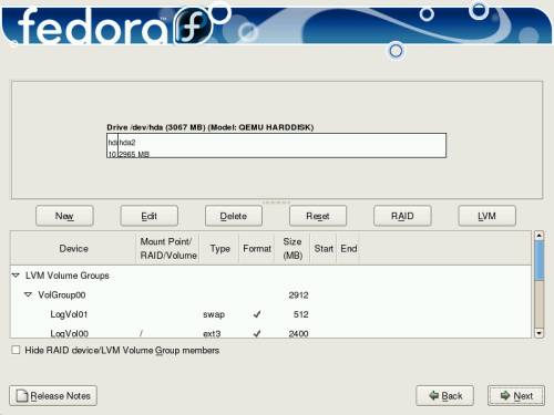 | Disk Druid is an interactive program for editing disk partitions. Users run it only within the Fedora installation system. Disk Druid enables you to configure Linux software RAID and LVM to provide more extensible and reliable data storage. |