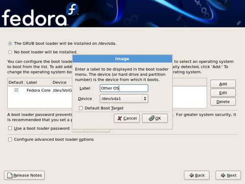 | If you have other operating systems already installed, Fedora attempts to automatically detect and configure GRUB to boot them. You may manually configure any additional operating systems if GRUB does not detect them. To add, remove, or change the detected operating system settings, use the options provided. |