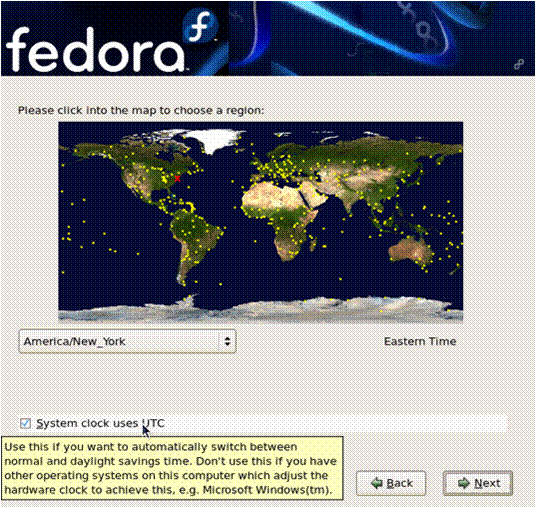 | Do not enable the System clock uses UTC option if your machine also runs Microsoft Windows. Microsoft operating systems change the BIOS clock to match local time rather than UTC. This may cause unexpected behavior under Fedora. |