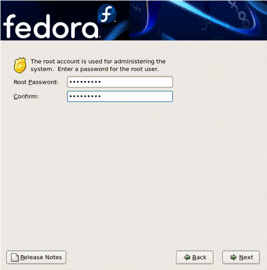 | Enter the root password into the Root Password field. Fedora displays the characters as asterisks for security. Type the same password into the Confirm field to ensure it is set correctly.
