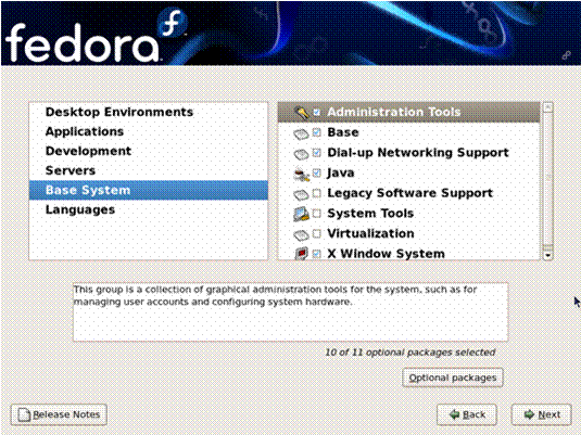 | If you select a package group, Fedora automatically installs the base and mandatory packages for that group. To change which optional packages within a selected group will be installed, select the Optional Packages button under the description of the group. Then use the check box next to an individual package name to change its selection. |