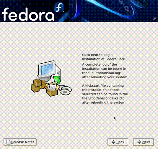| No changes are made to your computer until you click the Next button. If you abort the installation process after that point, the Fedora system will be incomplete and unusable. To return to previous screens to make different choices, select Back. To abort the installation, turn off the computer. |
