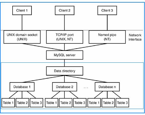 | When the server starts up, it opens any log files that you request it to maintain and then presents a network interface to the data directory by listening for various types of network connections. To access data, client programs establish a connection to the server and then communicate requests as SQL queries to perform the desired operations-for example, creating a table, selecting records, or updating records. |