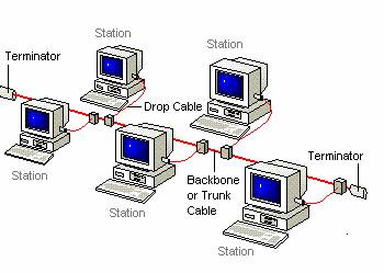 | A regular bus network uses drop cables and external transceivers to connect each station to the main "backbone" cable. |