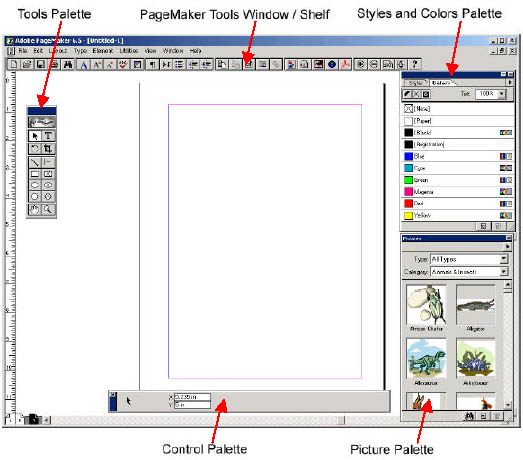 | The PageMaker window contains many parts that work together to make creating a document easier. |
