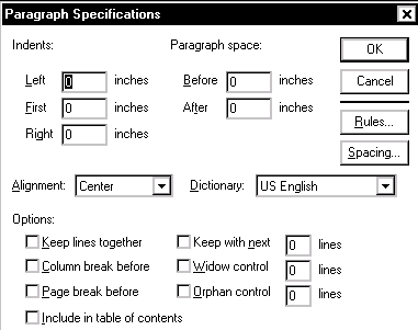 | The Paragraph Specifications dialog box is used to define paragraph characteristics including indents from the left and right margin and the first line of text. It also defines the amount of space that appears before and after the paragraph etc. |