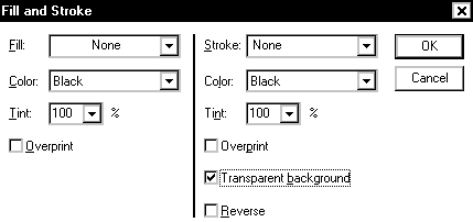 | The Fill & Stroke dialog box is used to define the formatting characteristics of elements created with the PageMaker drawing tools. The Fill feature lets you specify patterns and the Stroke feature lets you specify line weight. In this dialog box, you can also control the color of the elements and how they will appear in respect to the background. |