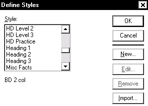 | You have several options while creating a style. For example, you can define a new style based on an already existing one and/or work ahead by choosing a style for the paragraph following the newly created one. 1. From the Type menu, select Define Styles. The Define Styles dialog box appears. |