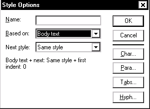 | 3. In the Name box, type a name for your new style. 4. Optional: To define a new style based on an already existing one, from the Based on pull-down listing, select the desired existing style. If you like everything about a style except the tab stops, you can change the tabs and give the style a new name - everything else will remain the same. 5. Optional: To select a style for the paragraph following the newly created paragraph style, from the Next style pull-down listing, make the desired selection. 6. Define the style by making the appropriate changes through the following buttons. Char Used to define the type specifications including font, type size, leading and enhancements (e.g., boldfacing). Para Used to define the paragraph specifications including paragraph margins, space between paragraphs, widow/orphan control and page/column break control. Tabs Used to define the tab settings. Hyph Used to turn hyphenation on and off and for controlling the hyphenation process. 7. To close the Style Options dialog box, click Ok. 8. To close the Define Style dialog box, click Ok. |
