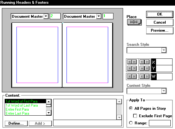 | When creating running headers and footers for a story through the PageMaker Plug-in, you can choose to write your own content or use a selector option from the Content listing in the Running Headers and Footers dialog box. If you use one of those selectors, the header or footer's content will change on each page according to the words and paragraphs on that specific page. |