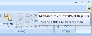 | The Simplest method to get help from Power Point 2007 is to press the F1 key or Click on help button. If you press F1 key while you're performing some doubtful task deep inside some strange dialog box or task pane, Power Point summons help for that specific issue, telling you how to do what you want to do. |