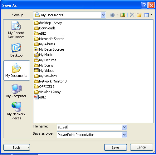 | When you save a Presentation at first time, the "Save As" dialog box appears. Use the "Save As" dialog box to locate the folder in which you want to save your Presentation and to give your Presentation a name. After you have saved your Presentation at least once, you can save any changes you make to your Presentation simply by clicking the Save after you click the Microsoft Office button. |