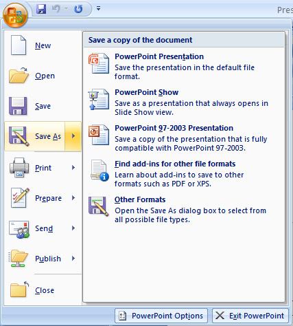 | 2. Click Save As. (remember, if you're sending the document to someone who does not have Office 2007, you will need to click the Office Button, click Save As, and Click PowerPoint 97-2003 ) . |