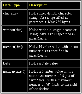 | With CREATE TABLE, a new table can be created. A table can be considered as a basic structure within which data is stored. It consists of rows and columns. A row represents a single record while a column represents attributes/fields which can be thought of as one of the components contributing to make a record. While creating a table, data types have to be mentioned for each field. |