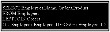 | The LEFT JOIN returns all the rows from the first table (Employees), even if there are no matches in the second table (Orders). If there are rows in Employees that do not have matches in Orders, those rows also will be listed. |