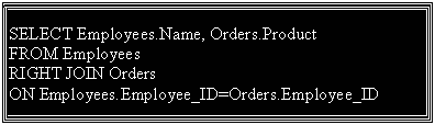 | The RIGHT JOIN returns all the rows from the second table (Orders), even if there are no matches in the first table (Employees). If there had been any rows in Orders that did not have matches in Employees, those rows also would have been listed. |