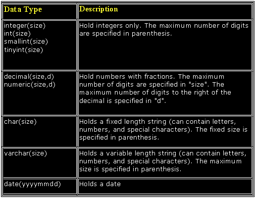 | The data type specifies what type of data the column can hold. The table below contains the most common data types in SQL: |