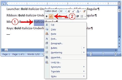 | 1. On the line that begins with "Mini Toolbar," select the word "Italicize." You can place the cursor before the letter "I" in "Italicize." Press the Shift key; then press the right arrow key until the entire word is highlighted. | |||