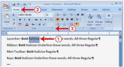 | 1. On the line that begins with "Ribbon," select the word "Italicize." You can place the cursor before the letter "I" in "Italicize." Press the Shift key; then press the right arrow key until the entire word is highlighted. | |||
