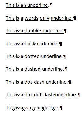 | If you use the dialog box launcher, then following are some of the underlines that are available: | |||