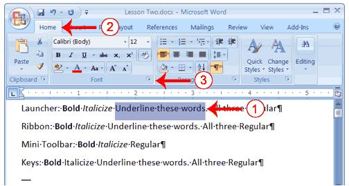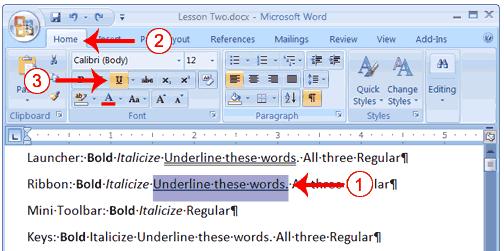 | 1. select the words "Underline these words.", on the line that begins with "Ribbon". | |||