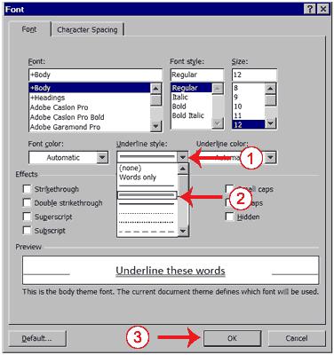 | 6. Click OK to close the dialog box. The underline you selected appears under the words. | |||