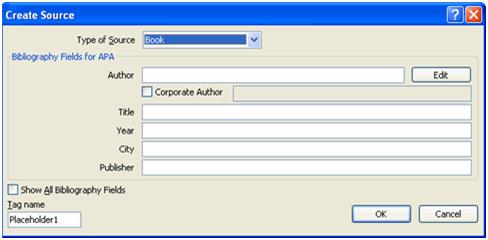| 7. If you need extra fields, be sure to click the Show All Bibliography Fields check box |