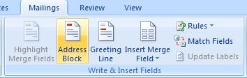 | In the Mailings tab, there is a group of Write & Insert Fields. |