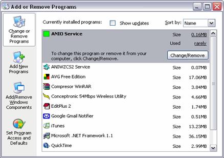 | To select the program we want to change or remove we have to click on it. On the image above ANIO Service appears highlighted. |