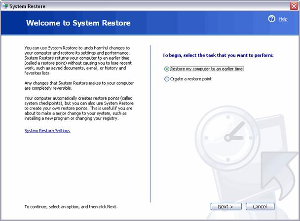 | Note: When you run this tool a screen like the one below will appear. This window gives you the possibility to either Restore my computer to an earlier time or Create a restore point. |