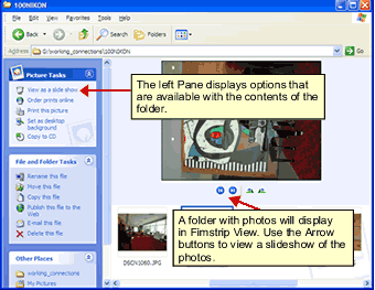 | In folder that store pictures, you may notice that pictures will display a bit different. This is the Filmstrip View. Use the arrow buttons to click through a slideshow of the photos in the folder. |