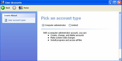 | 4. Click Computer administrator or Limited, depending on the type of account you want to assign to the new user, and then click Create Account. |